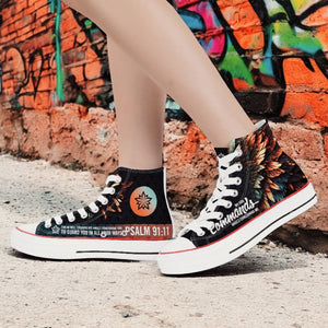 These shoes don’t just cover your feet—they remind you of the divine protection that covers your life. The My God Commands Angels Hightops feature vivid, graffiti-style angel wings and the power-packed promise of Psalm 91:11: “For He will command His angels concerning you to guard you in all your ways.”