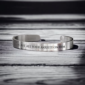 This sleek bangle is engraved with the comforting words "Cast All Your Anxiety," inspired by 1 Peter 5:7, serving as a daily reminder to let go of worries and place your trust in God’s care.