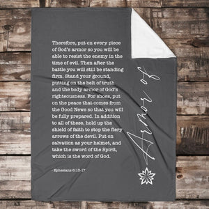 The Armor of God Scripture Blanket is designed in powerful charcoal grey—a color that speaks of strength, resolve, and unshakable faith. Printed with Ephesians 6:13–17, this blanket is for every believer who knows the fight is real—but so is our defense. It’s a covering of spiritual protection, a daily reminder that you are not left exposed—you are equipped.