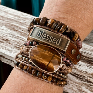 Pairing the bold Blessed Leather Wristlet with the grounding strength of Tiger’s Eye in the Autumn Night Long-Strand, this duo brings together truth and timeless style. Whether you’re at work, out with friends, or deep in prayer, this stack speaks life and confidence right from your wrist.