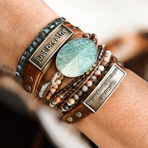 Featuring two calming leather wristlets and a radiant iridescent long-strand, this stack captures both serenity and strength. Slip it on in the morning as a wearable prayer: Lord, I trust You. I choose calm. I choose peace.