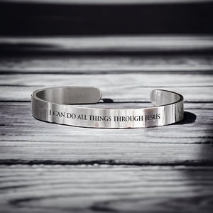 Empower yourself with the I Can Do All Things Through Jesus Bangle, meticulously crafted from premium stainless steel for both strength and elegance.